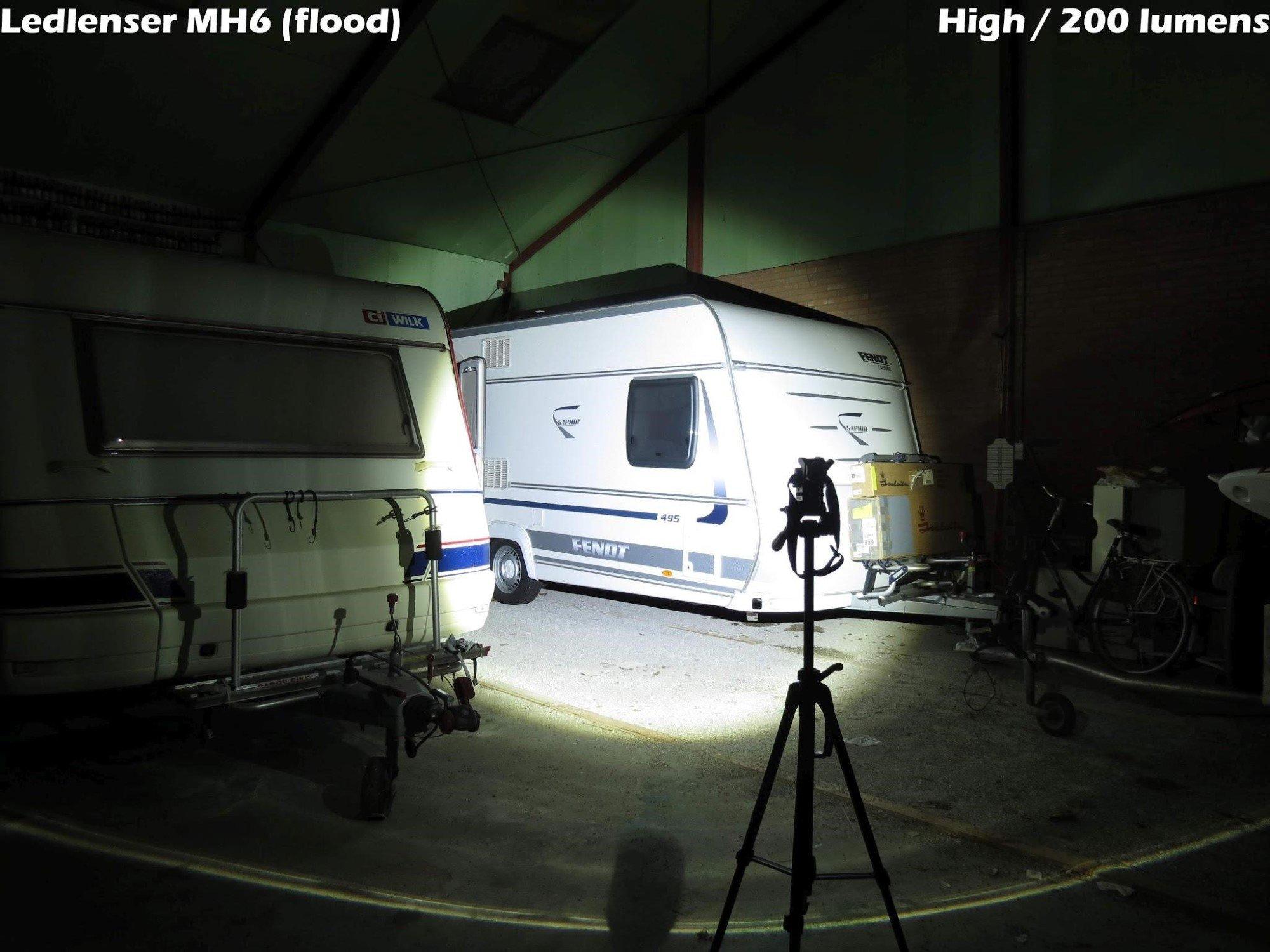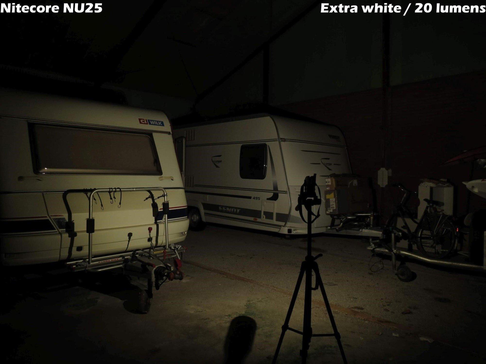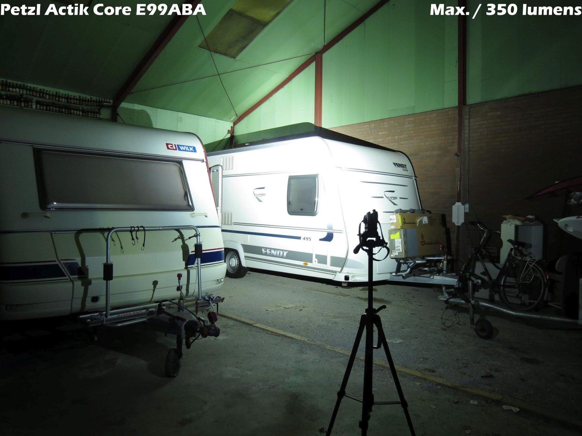 De eerste locatie is een opslagloods waarin wat caravans staan. Dit geeft een leuk beeld van hoe deze hoofdlampen het op de camping doen. Mooie bijkomstigheid is dat de witte caravans ook goed de tint van de lampen laten zien. We starten met de witte led in de hoogste stand. Om het overzichtelijk te houden de vijf lampen in alfabetische volgorde.