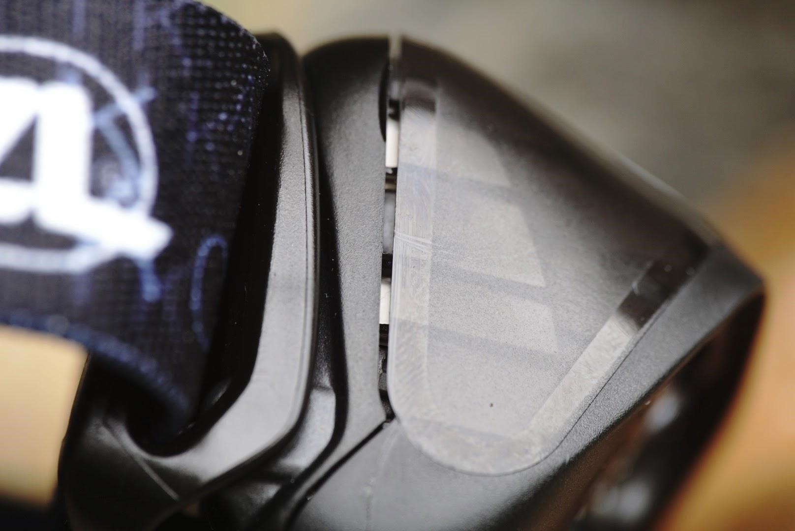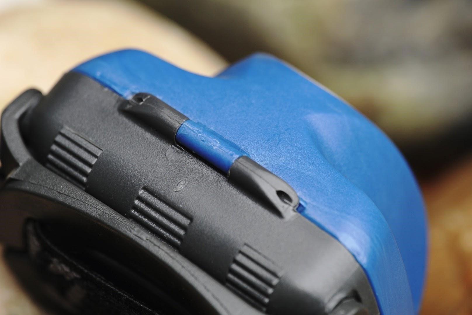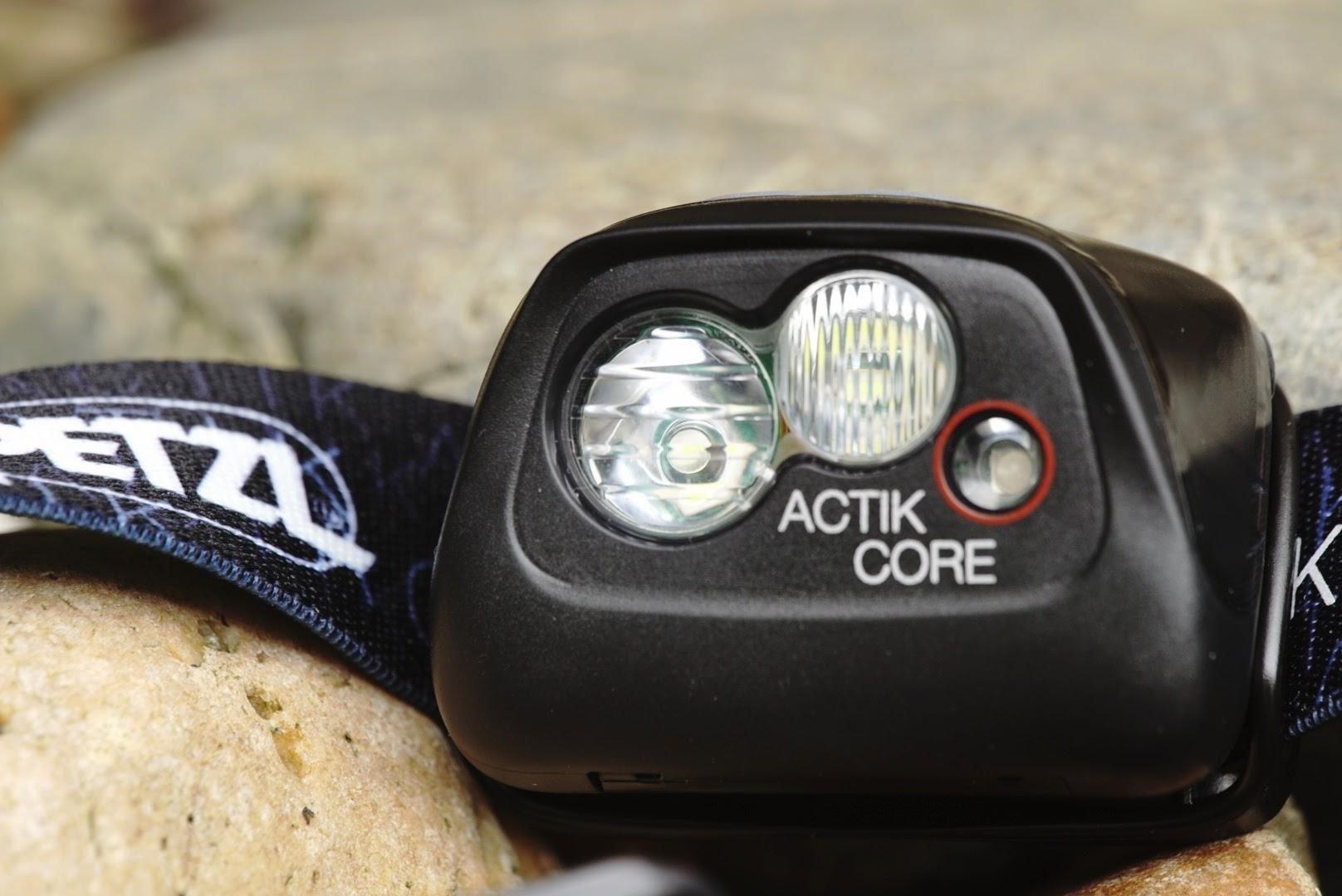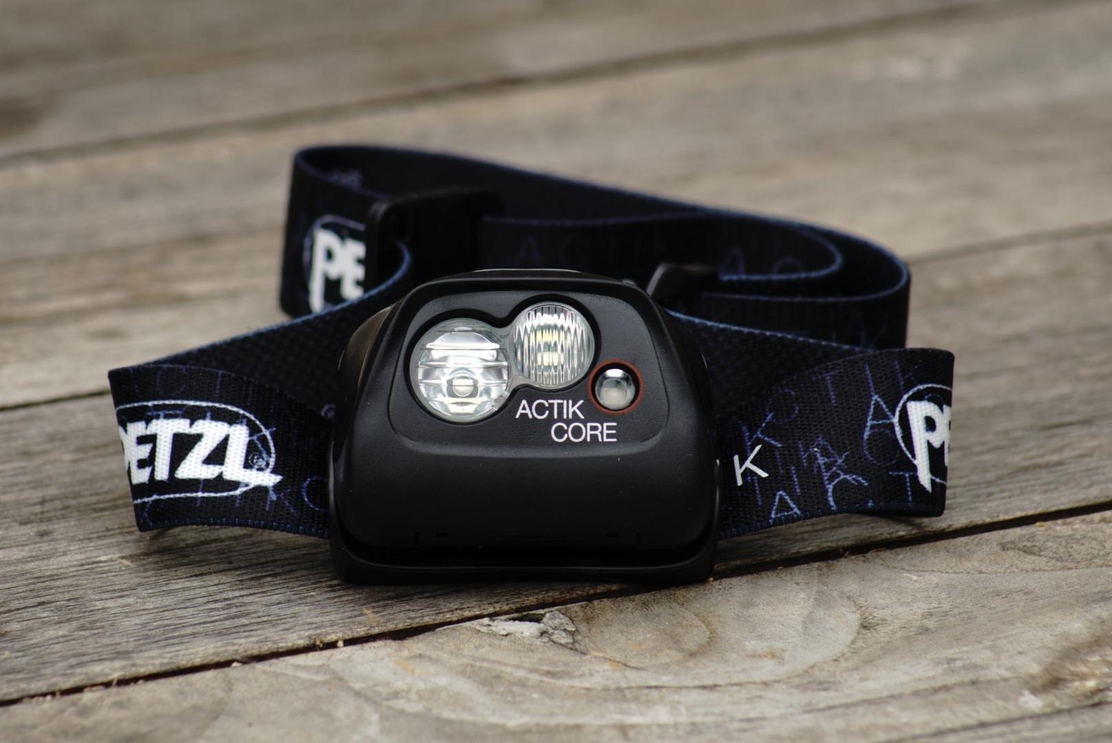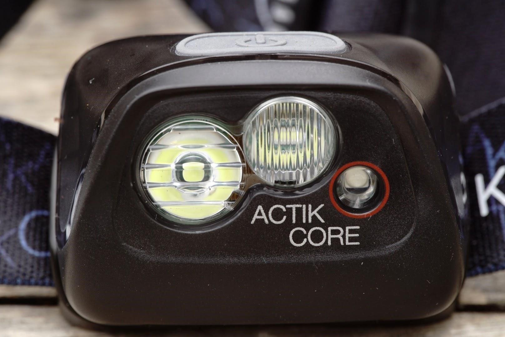 De Actik Core van Petzl heeft (vanaf de zijkant bekeken) een driehoekig ontwerp; de lampen staan daardoor altijd al schuin naar beneden gericht. Bij deze lamp is duidelijk wat meer glimmend plastic aanwezig, het doet net allemaal wat “goedkoper” aan als bij de Fenix en de Nitecore. Het “front” van de lamp vind ik wel fraai met de dubbele lamp en de extra rode led. De Petzl kan, in tegenstelling tot de Nitecore en de Fenix, wel open. Binnenin ziet het er netjes uit, de accu of de batterijen sluiten goed strak aan. De drie leds zitten in gladde reflectors, die in het algemeen niet diep zijn. Best logisch, een hoofdlamp wordt meestal niet ingezet om ver te kunnen schijnen. Opvallende details aan de Actik Core zijn de grote drukschakelaar en de structuur van de lensjes, die beide op een andere manier de lichtbundels verstrooien. De hoofdband is wat smaller, maar blijft goed op zijn plek. Apart detail: In de hoofdband zit een fluitje verwerkt. Het kan je redding zijn wanneer je in nood zit; leuke vondst van Petzl! De Actik Core blijft wat algehele afwerking betreft toch wat achter op de Fenix en de Nitecore, wat niet wil zeggen dat de lamp slecht in elkaar zit.