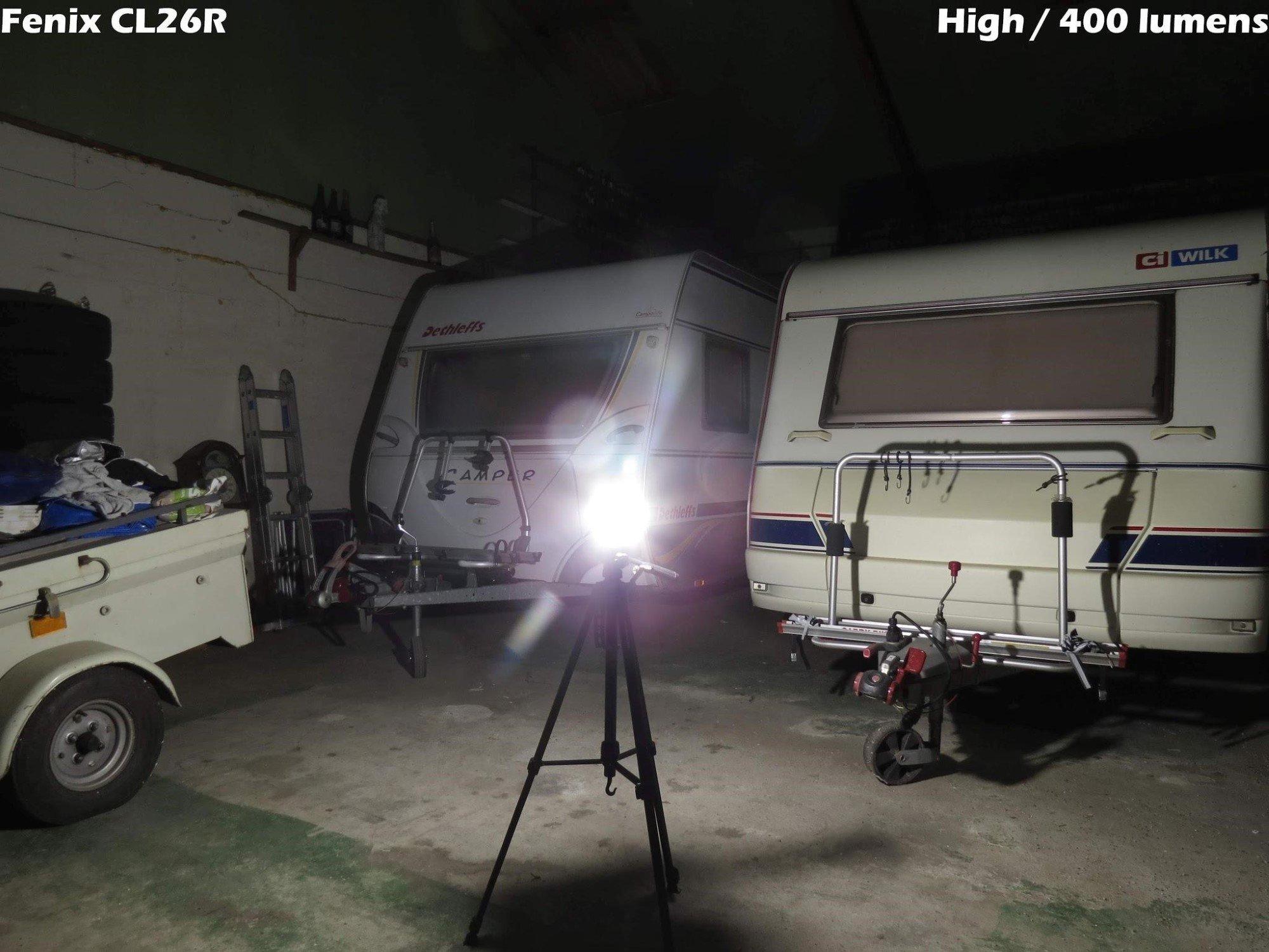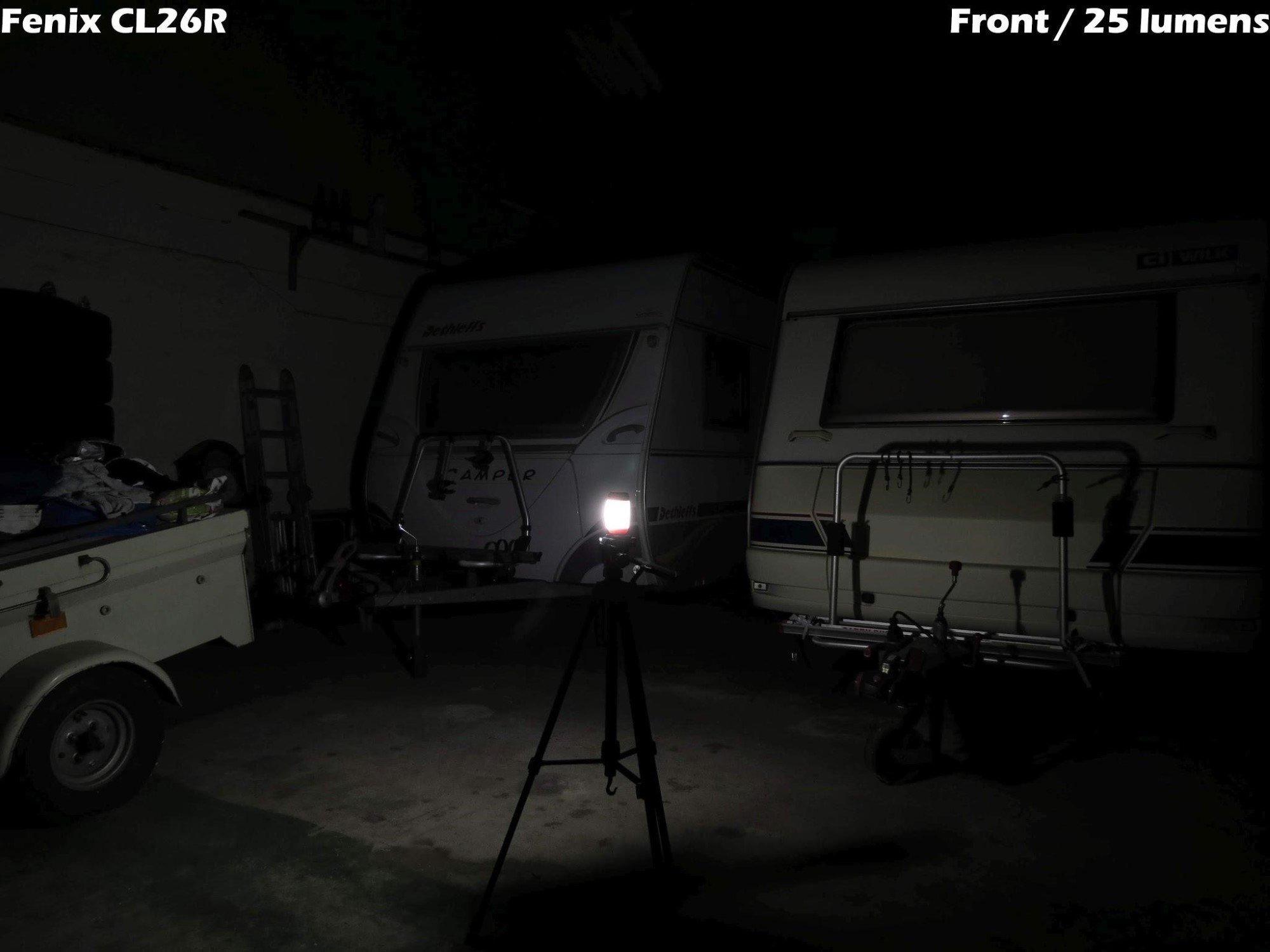 We starten met CL26R op de hoogst mogelijke stand. Zoals je ziet, komt er verrassend veel licht uit zo’n kleine lamp. In een kleine tent of caravan is deze stand eigenlijk te fel; meer geschikt voor buiten dus.