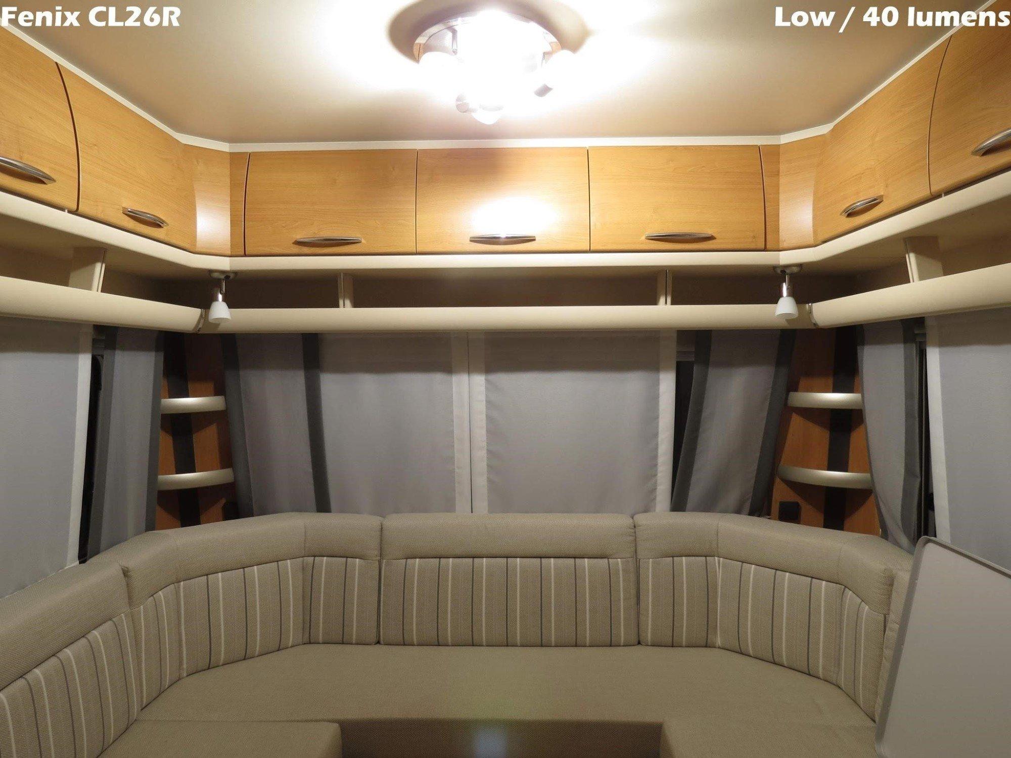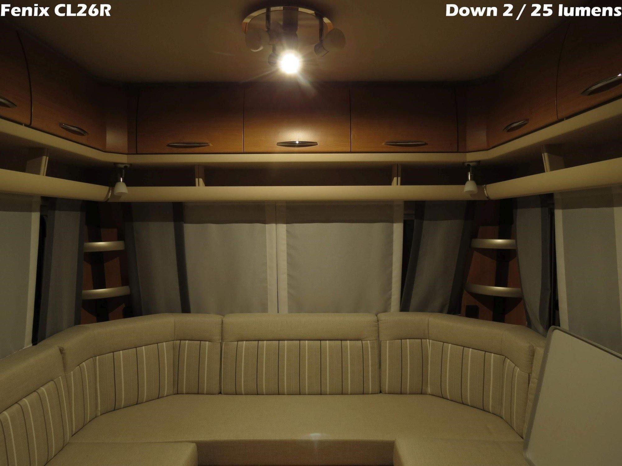 Ook nog interessant om naar te kijken: de onderverlichting oftewel de down-optie. Ik heb de CL26R hiervoor opgehangen aan het plafond in een caravan. Zie het verschil tussen het meer gerichte licht van de down-optie ten opzichte van een vergelijkbare lichtstand van het hoofdlicht. Het meer gerichte licht zal door menig gebruiker als prettiger worden ervaren. Let ook eens op de lichtkleur van beide opties: dit zie je mooi terug aan de gordijnen, de banken en de kastjes.