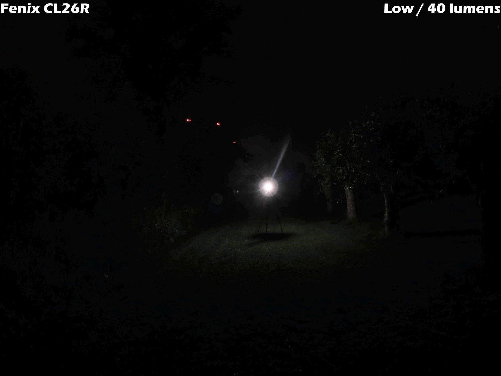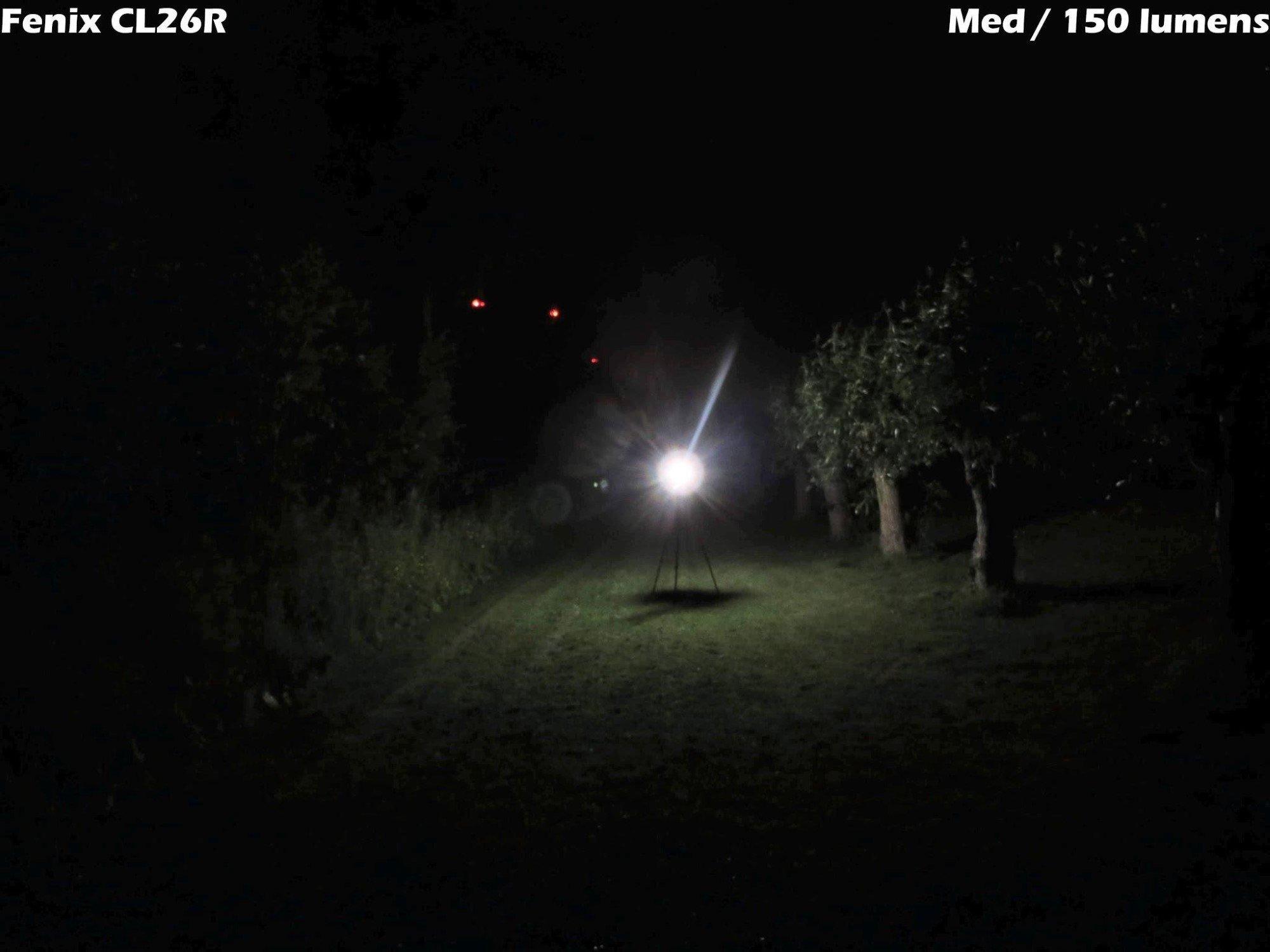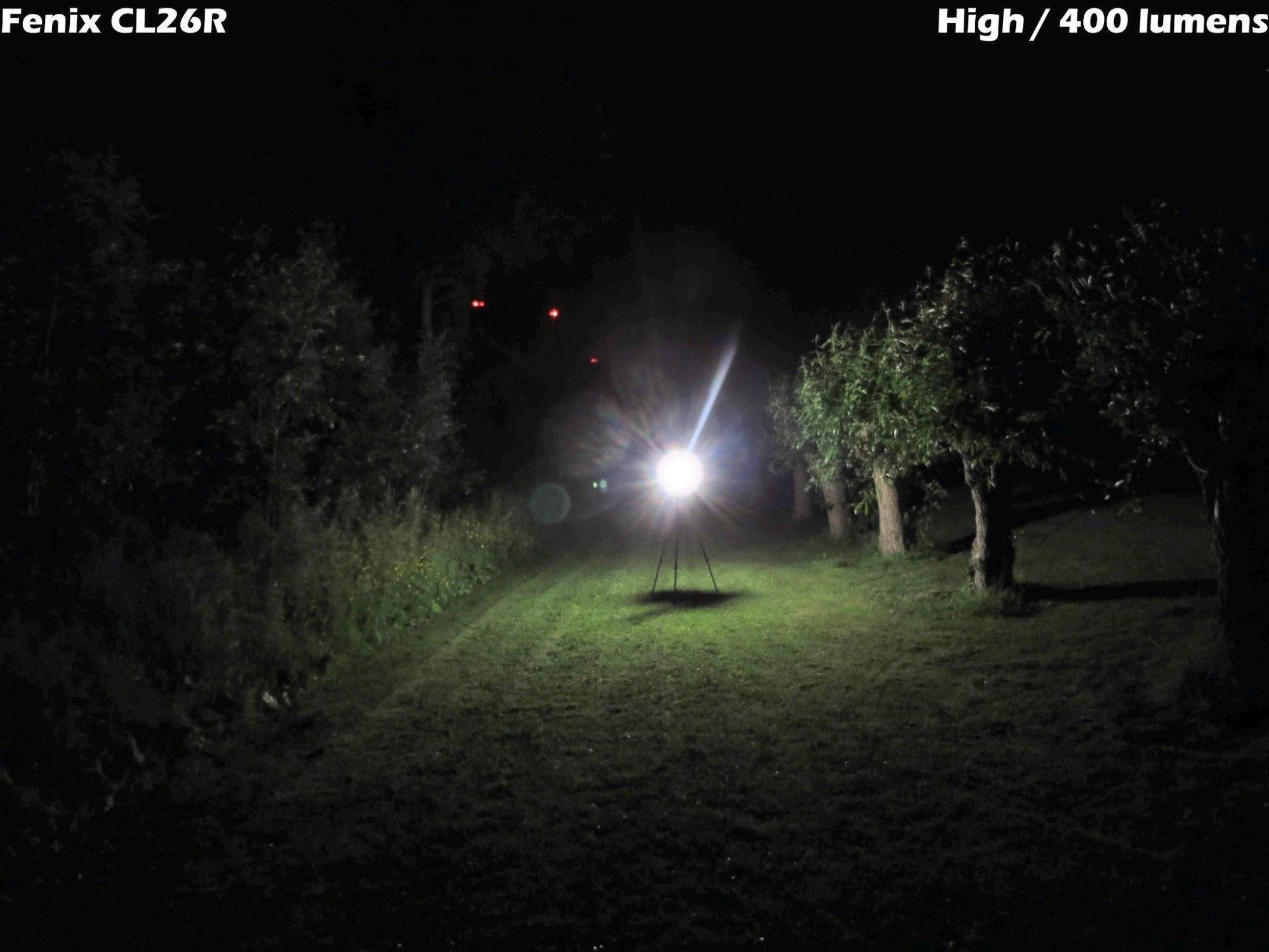 Nu nog naar buiten! De lamp staat dit keer op een grasveld tussen twee bomenrijen op ongeveer 15 meter afstand van de camera. Ik laat hier de lichtstanden zien van het hoofdlicht, van laag tot hoog. De camera had dit keer wat meer moeite om het licht op de plaat te zetten, je ziet wat diafragmavlekken; die zul je in het echt niet tegenkomen. De foto’s laten goed zien dat de CL26R tot pakweg 15 meter rondom kan verlichten op de hoogste stand.