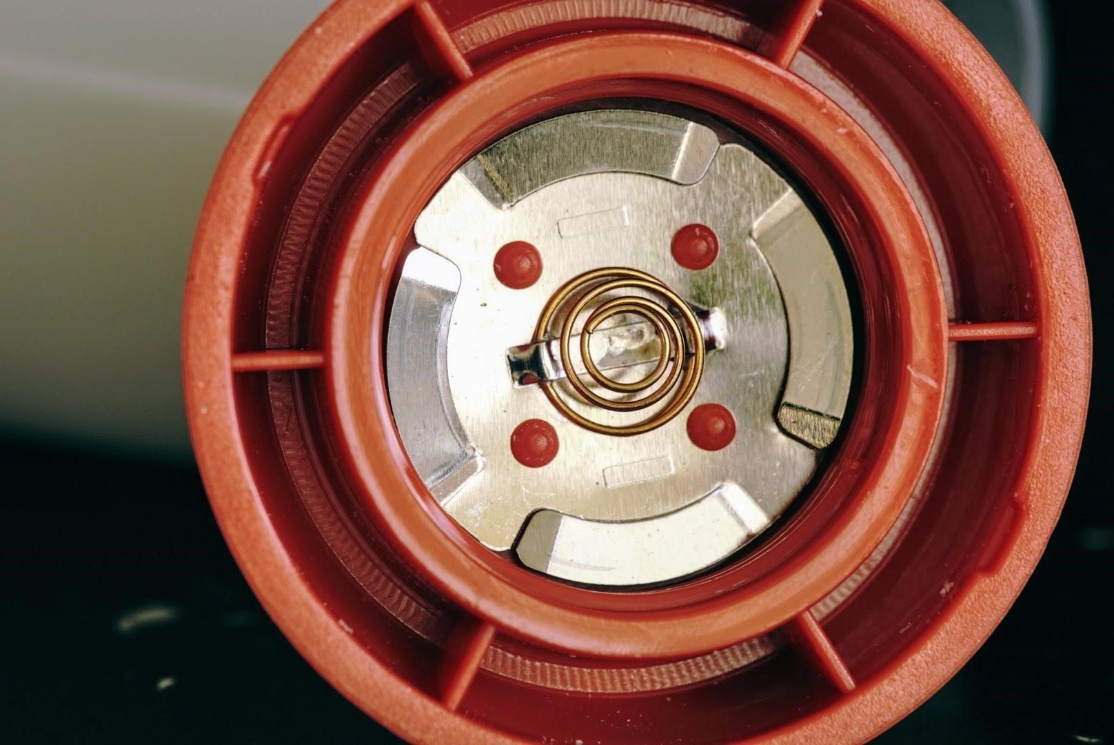 Aan de andere zijde zit de rubberen schakelaar. Op het eerste gezicht dacht ik dat de schakelaar een power-indicator ingebouwd had, dit is echter optisch bedrog. Een van de bijzonderheden van de CL26R zien we onderop de lamp: Daar zit de tweede lamp ingebouwd. Van de gebruikte lichtbronnen is niet veel te zien, want ook hier worden de leds aan ons oog onttrokken door diffuus plastic. Met behulp van de ophanghaak draai je de CL26R eenvoudig open. Wat direct opvalt In het batterijhuis is dat je nu (in tegenstelling tot de CL25R) door middel van een icoon ziet hoe je de batterij moet plaatsen. Twee vergulde veren zorgen dat de lamp intact blijft tijdens een val, ook is het batterijhuis verstevigd met aluminium. Dit heeft Fenix gedaan om de batterij beter te isoleren wanneer je de lamp in extreme kou gaat gebruiken. Doordat er in de schroefdop een magneet zit blijft de batterij meestal “plakken” wanneer je de lamp opent. Bij doorsnee gebruik hoeft de lamp weinig geopend te worden doordat de batterij direct kunt opladen. De lamp sluit met een duidelijke 'klik' en alles zit weer keurig op zijn plek. Mijn conclusie van dit hoofdstuk: De CL26R zit gewoon uitstekend in elkaar, ik kan qua bouw en afwerking geen zwakke plekken vinden. Hieronder nog wat foto’s ter verduidelijking!