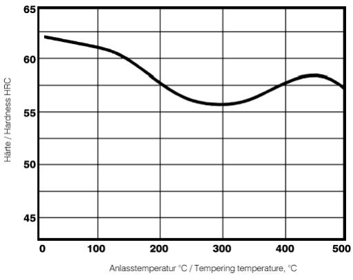 Ook kan dit gevolgen hebben voor het scherptebehoud, de taaiheid en de roestbestendigheid. Dat zie je niet aan het getalletje ‘61HRC’. De volgende grafiek komt uit de datasheet (een soort handleiding) bij Böhler N690-staal. Hierin zie je op de verticale as de Rockwell C-hardheid, en op de horizontale as de temper-temperatuur die je daarvoor moet aanhouden.