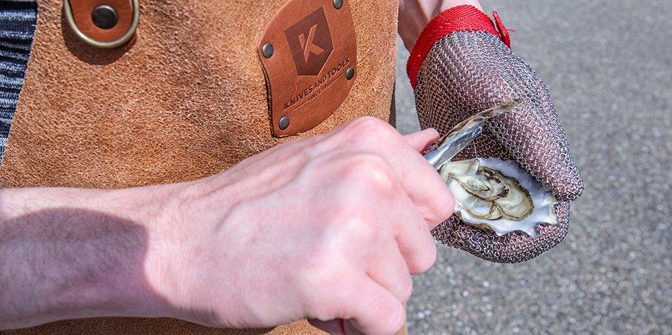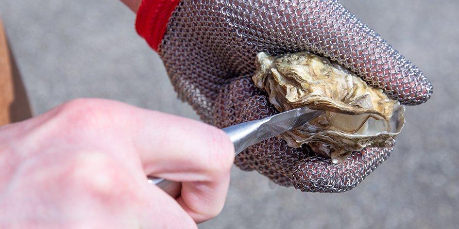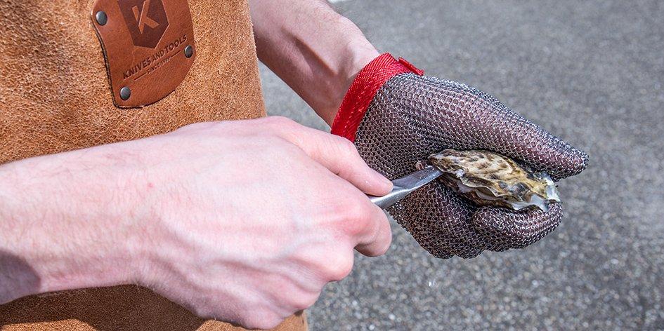 Bescherm je handen: draag een beschermende oesterhandschoen. Een oesterhandschoen is een maliënkolder voor je hand. Het dichte patroon beschermt je hand tegen de scherpe punt en geeft grip.