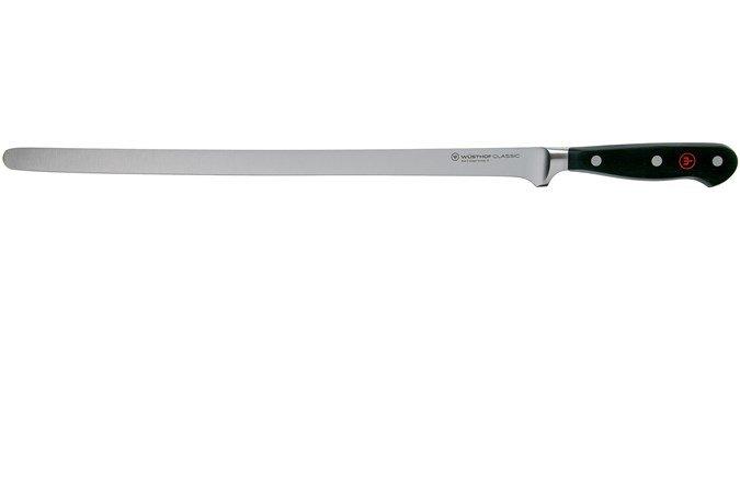 Een zalmmes gebruik je om dunne, gelijkmatige plakjes zalm te snijden. Het zeer flexibele lemmet is rond de 30 cm lang. Dat heeft als voordeel dat je in één keer een plakje kan afsnijden zonder 'zaagbeweging'. De punt is afgerond om de zalm niet beschadigen. Natuurlijk kan je dit mes ook prima gebruiken voor rauwe ham of carpaccio.