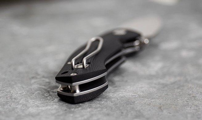 De handgreep van de Ace Biblio doet zeker niet onder aan de pracht van het lemmet. De handgreep zit namelijk zo vol met mooie details dat het moeilijk is om te beslissen waar te beginnen. Het meest opvallende aan de handgreep zijn de zwarte fraai afgeronde G10 greepschalen, een oersterk materiaal en uitermate geschikt voor een edc-mes. De handgreep vult de hand goed en is erg ergonomisch. De vloeiende organische lijnen van het design helpen hier zeker bij. Het G10 is gezandstraald zodat de handgreep extra veel grip heeft. Hierdoor komt ook een mooi houtachtig patroon in het G10 dat de handgreep net dat kleine beetje bijzonderderder maakt. Deze greepschalen rusten op AISI 420-stalen liners. Tussen beide greepschalen zitten zandlopervormige standoffs die het mes bij elkaar houden. De wire-clip is voor links-en rechtshandigen omzetbaar en zeer makkelijk te gebruiken. Deze elegante wire-clip wordt in de handgreep gehouden met een wijde schroef. GiantMouse heeft alle schroeven, liners, standoffs en de wire-clip afgewerkt met een gezandstraalde afwerking. Net als de G10 greepschalen. Dit bind de hele handgreep mooi samen en maak het tot één chic geheel!