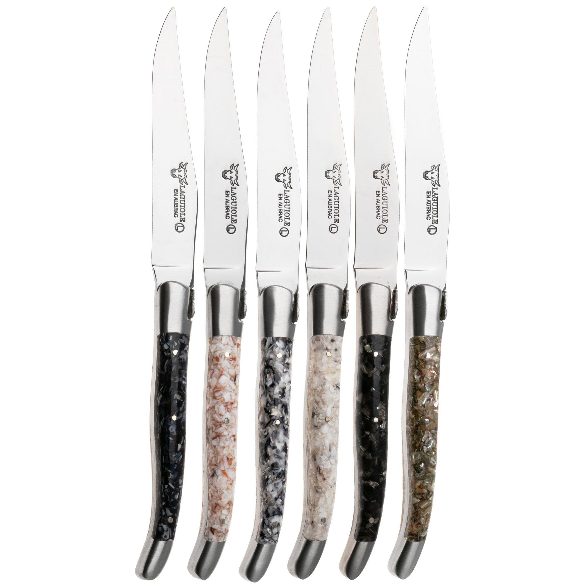 Laguiole en Aubrac Mixed Shells, Brushed Stainless Steel, 6-delige steakmessenset