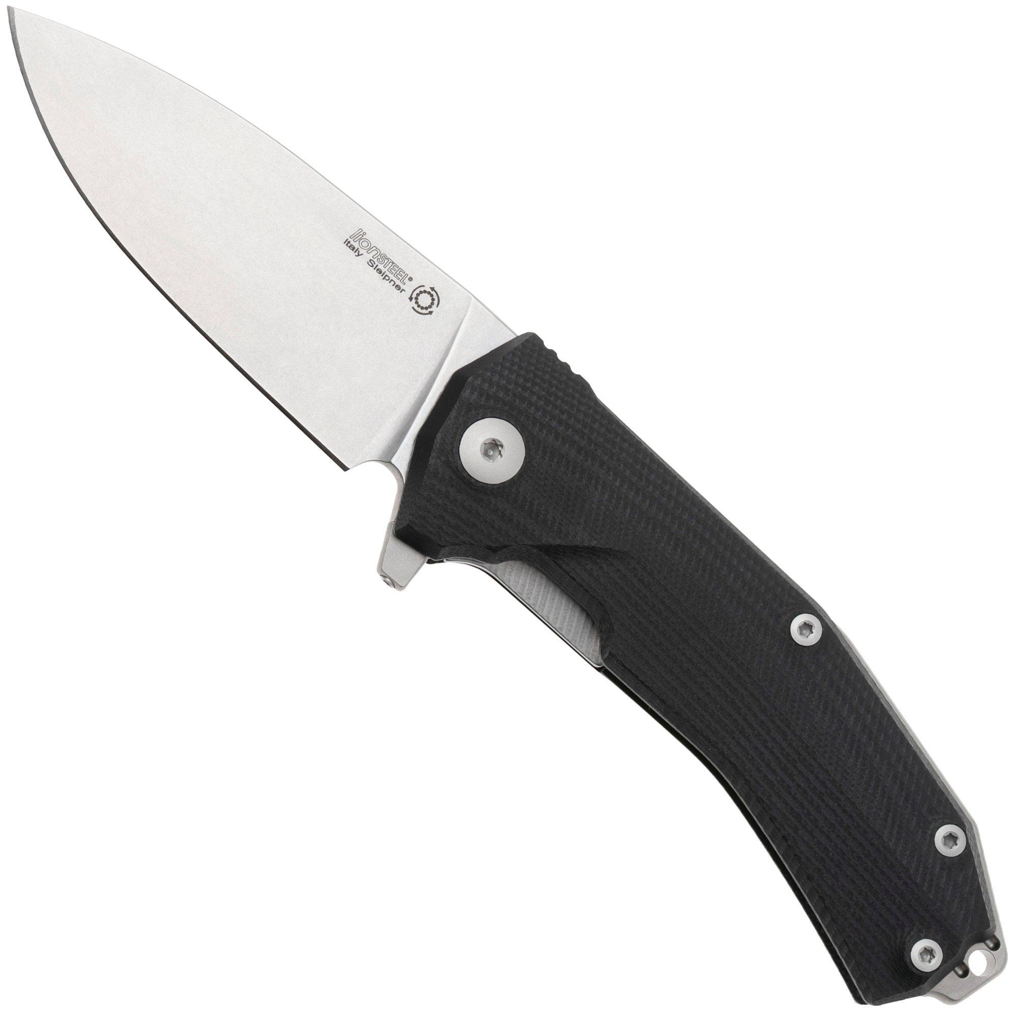 ik had al de nodige filmpjes gezien van de KUR . Maar toen ik dit mes in handen kreeg was ik meteen verkocht ! Wat een mooie mix van Italiaanse ontwerpkunst en compromisloos construeren . Het mes heeft fijn in de hand liggende G-10 greepschalen die van een ribbelpatroon zijn voorzien voor nog betere grip en 3D zijn gefreesd . De grotere broer van de framelock TRE zeg maar . Maar dit mes heeft fraai gemaakte liners van gehard RVS ( waar andere fabrikanten hun lemmets van maken ) die haast verstop en strak passend verzonken zitten in de G-10 schalen . Alleen de ( ook weer 3D gefreesde ) lip voor het ontgrendelen zie je zitten . De lockup is helemaal volgens het boekje ( de lockbar zit precies een dikke mm achter het lemmet ) en de lockbar is voorzien van een keramische kogel voor zeer lange levensduur . Alle vormen van de greep en lockbar zijn zo gekozen dat het geheel in geopende toestand als een passende puzzel in elkaar grijpt , waardoor het erg goed in de hand ligt . Het lemmet is full flat grind Sleipner en afgewerkt met een mooie stonewash en komt zeer scherp uit de verpakking . Nergens scherpe kanten aan het lemmet behalve de snede ! Het staal is niet zo roestvrij als andere staalsoorten en het mes heeft om die reden wat extra zorg nodig na gebruik , het is echter wel bijzonder slijtvast . Simpel afspoelen en zorgvuldig afdrogen van het lemmet kan ik aanbevelen . Het lemmet loopt op kogellagers , aan de ene kant op het harde lemmet en aan de andere kant op het geharde RVS staal , in mijn ogen de best mogelijke oplossing . Het mes is voorzien van een flipper en knalt werkelijk open ! Het mes is trouwens ook discreet met twee handen te openen met slechts een mooie klik van het vergrendelen. Ik heb het mes nu 2 weken in gebruik en ben nog steeds verrast . Verrast door de scherpe prijs , de prachtige details zoals de bouten met typische lionsteel driehoekige koppen waardoor ze niet kunnen draaien bij los- of vastdraaien . verrast door de mooie mix van elegant Italiaans en rauwe kracht . Doet me denken aan Ducati motoren ! Verrast ook door de zeer mooi bevestigde dikke draadclip die goed bij het stoere uiterlijk past en zeer stabiel is en tevens naar de andere kant te verplaatsen is zodat linkshandigen ( en ik ben linkshandig ) ook veilig en handig met dit mes overweg kunnen . De bevestiging van die clip is onzichtbaar weggewerkt in de titanium backspacer . Een echte aanrader dus want in gebruik blijkt het mes ook nog eens heerlijk te snijden :-)