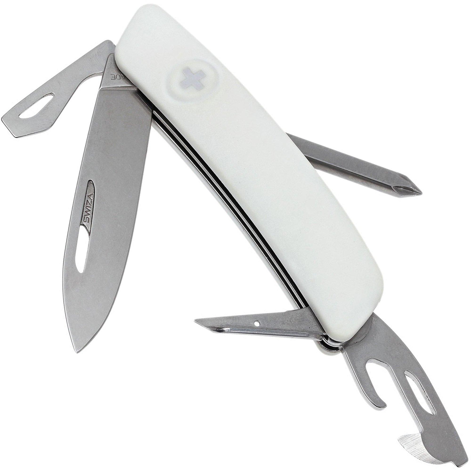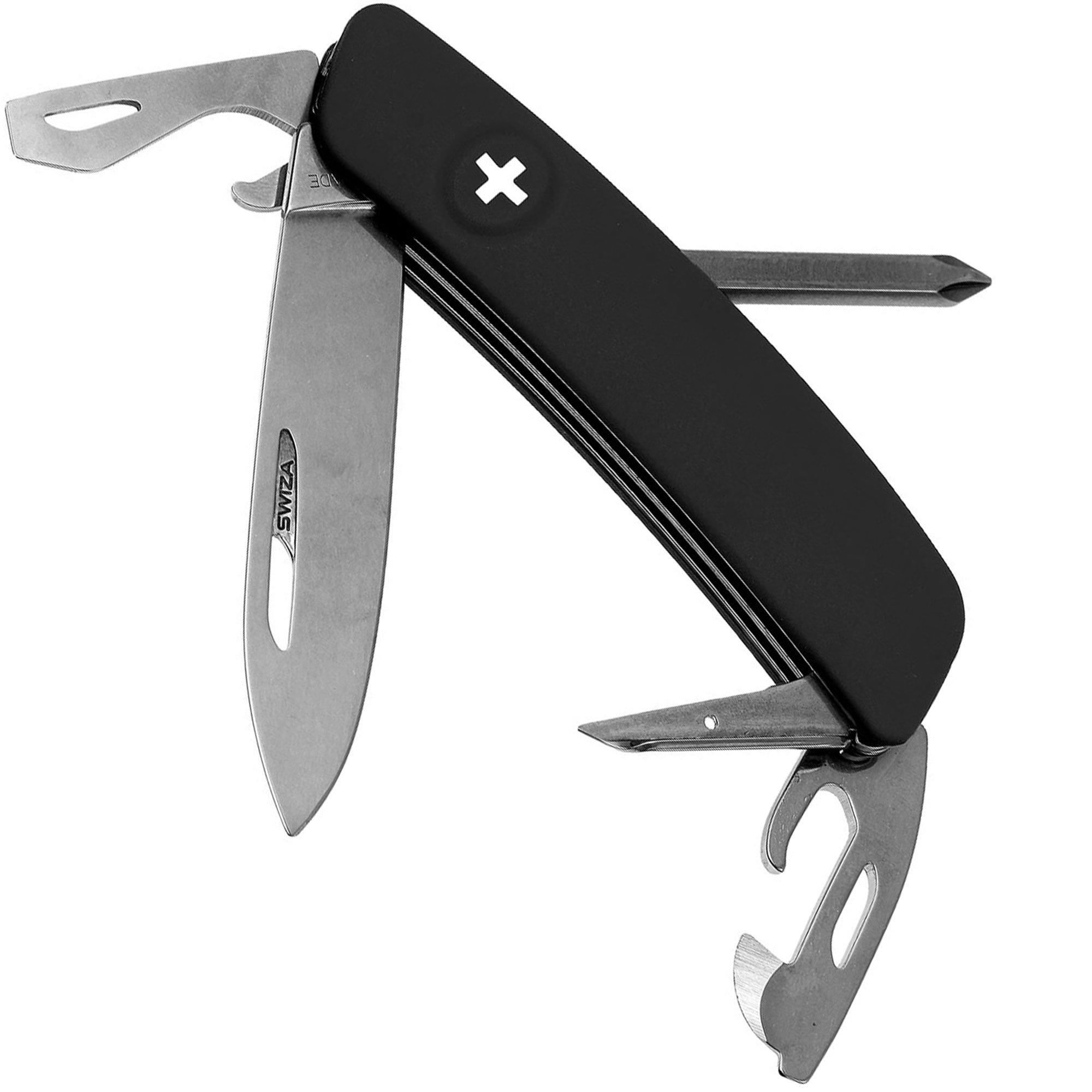priem, flessenopener, mes, schraper, kleine schroevendraaier, blikopener, pincet, draadstripper, kruiskopschroevendraaier