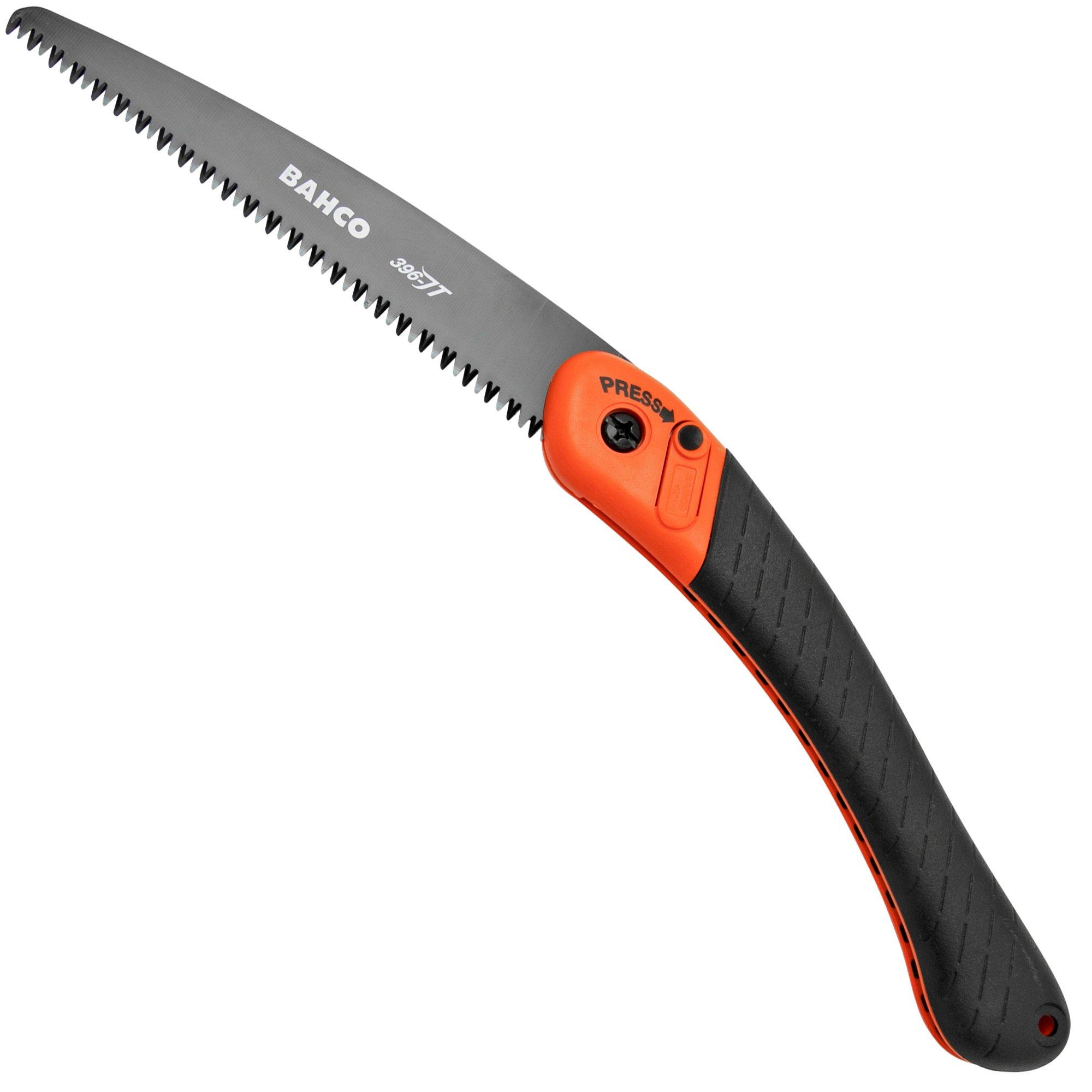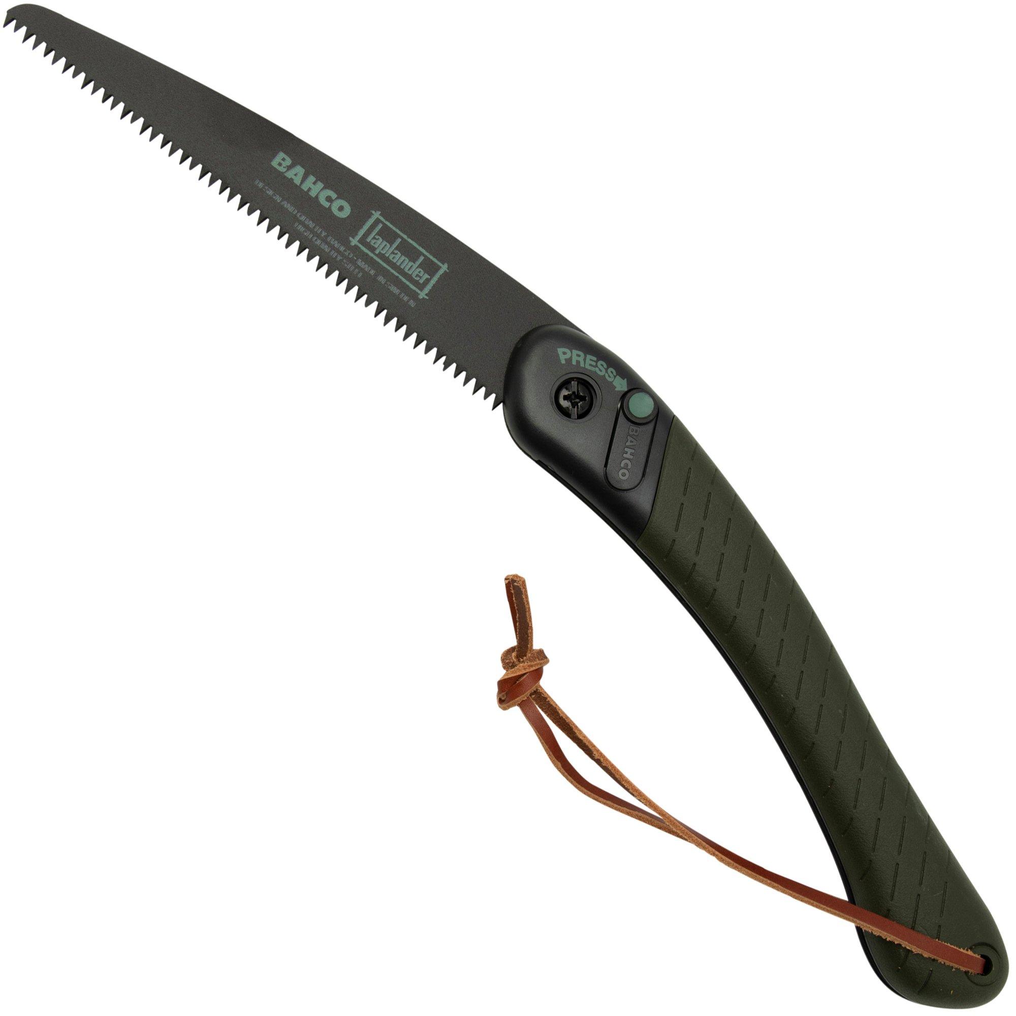 Bahco Sweden. Een compacte opvouwbare handzaag. Het blad is roestvast staal, met extra geharde tanden. Het blad is 1mm dik en flexibel. Het zal moeilijk kunnen breken bij verbuigen tijdens gebruik. Dit in tegenstelling tot concurrenten. Het blad kan ook vervangen worden. Al is dat mogelijks pas na jaren gebruik nodig. De zwarte coating wil na enige tijd gebruik wel verdwijnen, maar dan heb je wel veel plezier gehad van je tool. Het zaagblad zelf is recht, en je kan drukkend én trekkend zagen door de stand van de tanden. Het is zeker niet de meest efficiënte of snelste houtzaag in de markt (droog of nat hout), maar ze is wel het meest veelzijdig door de kortere vertanding. Je kan ze overal voor gebruiken: droog en nat hout, kunststof, zelfs botten. Het handvat is lang, zodat je met 1 of 2 handen kan werden. De afwerking is anti-slip met goede grip. Een opening voor lanyard is ook aanwezig. En tot slot kan je 'm ook veilig stellen opgeklapt en tijdens gebruik, dmv een drukknop. Dit zullen de bushcrafters graag horen!